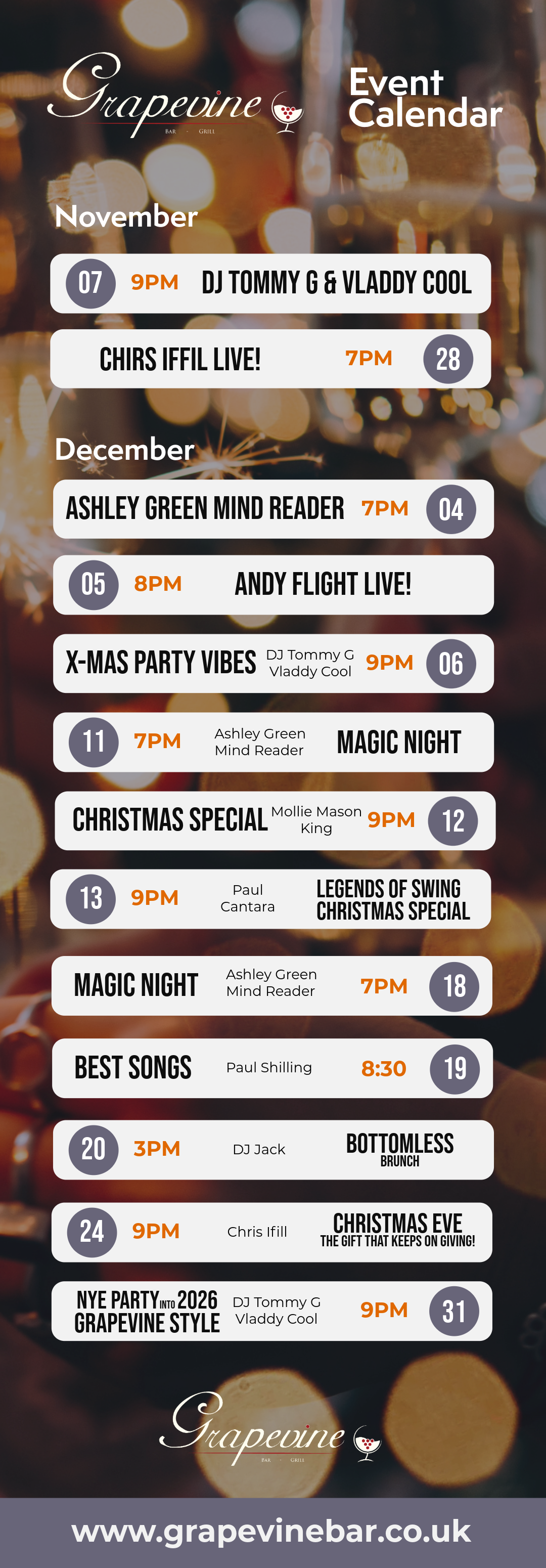 • 26th September 20:30 - Paul Cantara - 100% Mercury • 7th November 9PM - Tommy G & Vladdy Cool • 28th November 8:30PM - Chris Iffil Live! • 4th December 7PM - Magic Night With Ashley Green Mind Reader • 5 December 20:30 - Andy Flight Live! • 6 December 9PM - X-mas Party Vibes w/ Tommy G & Vladdy Cool • 11th December 7PM - Magic Night With Ashley Green Mind Reader • 12 December 9PM - Mollie Mason King Christmas Special • 13 December 9PM - Legends of Swing Christmas Special w/ Paul Cantara • 18th December 7PM - Magic Night With Ashley Green Mind Reader • 19th December 8:30PM -Paul Shilling Best Songs from 60's to 00's 20 December 3 PM Dj Jack Bottomless Brunch Vibes! 24 December 3-6 PM Chris Ifill Christmas Eve Live! • • NYE Party Into 2026 Grapevine Style • •